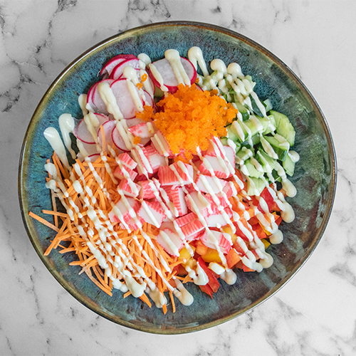 Surimi, paprika, komkommer, radijs, wortel, wasabi mayonaise en masago